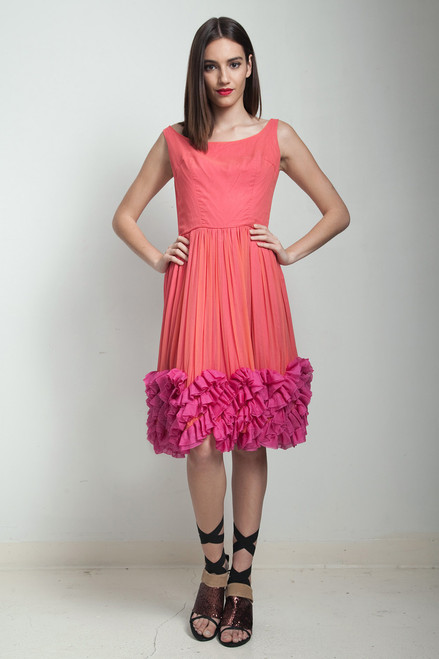 - heavy pink ruffles on bottom of dress